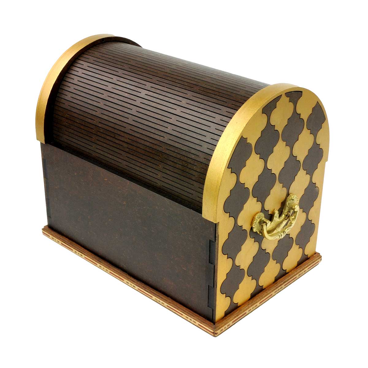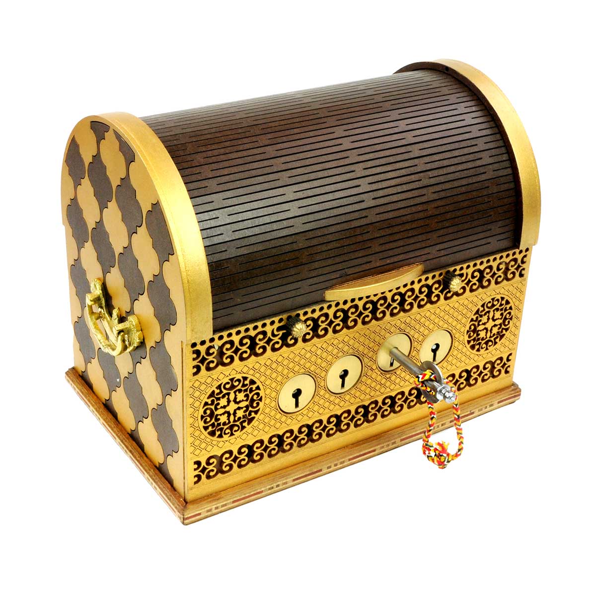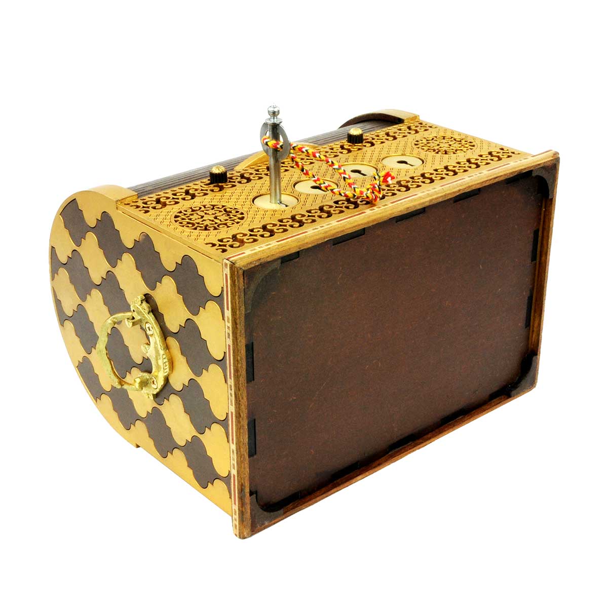 Lok kassans er renniholtr úr við sem snýr aftur í upphafsstöðu þegar kóðinn hefur verið leystur og hinu faldnu hlutunum hefur verið hreyft.
