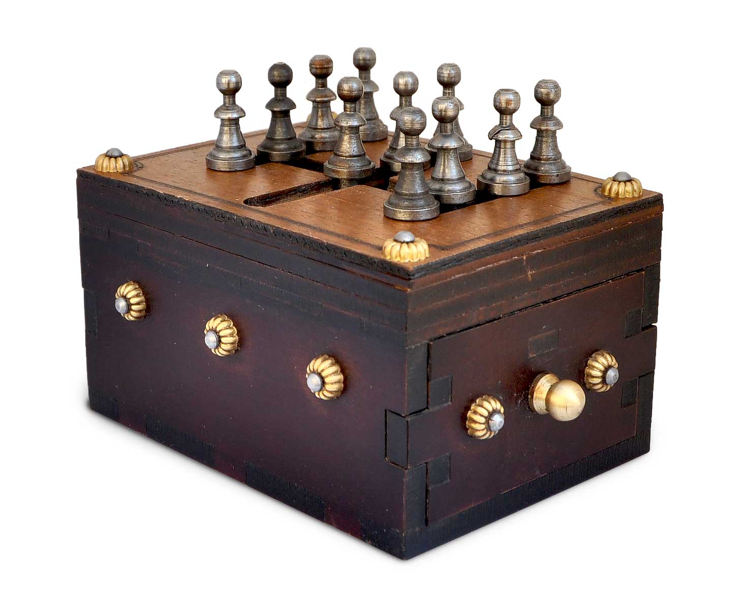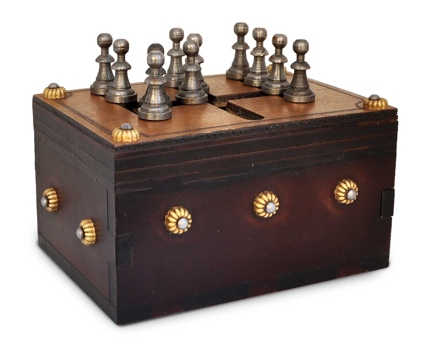 Á lokinu eru ellefu málm-skákstykki sem hægt er að færa og sem fela brellu til opnunar.