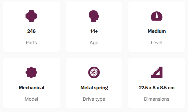 The Ugears Flying Ford Anglia has a spring drive that transmits torque to the rear wheels. The car can travel 3-4 meters on a single wind-up of the ratchet mechanism located on the undercarriage. The front wheels rotate 25 degrees in either direction and can be turned using the steering wheel or by pressing the wheels themselves, allowing the car to travel in a straight line or turn circles. But here’s where the real magic comes in: thanks to a special mechanism attached to the spring-loaded shaft running through the cabin, the Anglia has a secret “ejection” function. When the front license plate is pressed, the trunk and side doors pop open, while the tilting front seats and a lever in the trunk dramatically eject all passengers and contents from the vehicle.